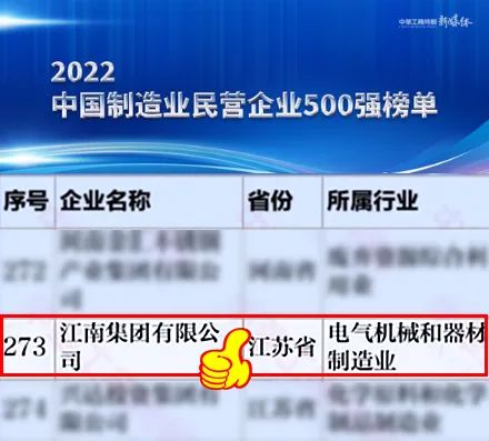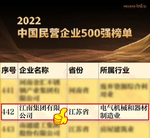 Today, the All ChinaFederation of Industry and Commerce released the list of "2022 China's Top500 Private Enterprises". Jiangnan Group won the title of "China'sTop 500 Private Enterprises" again by virtue of its strong strength, ranking442, up 40 places compared with last year.